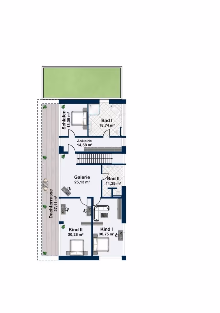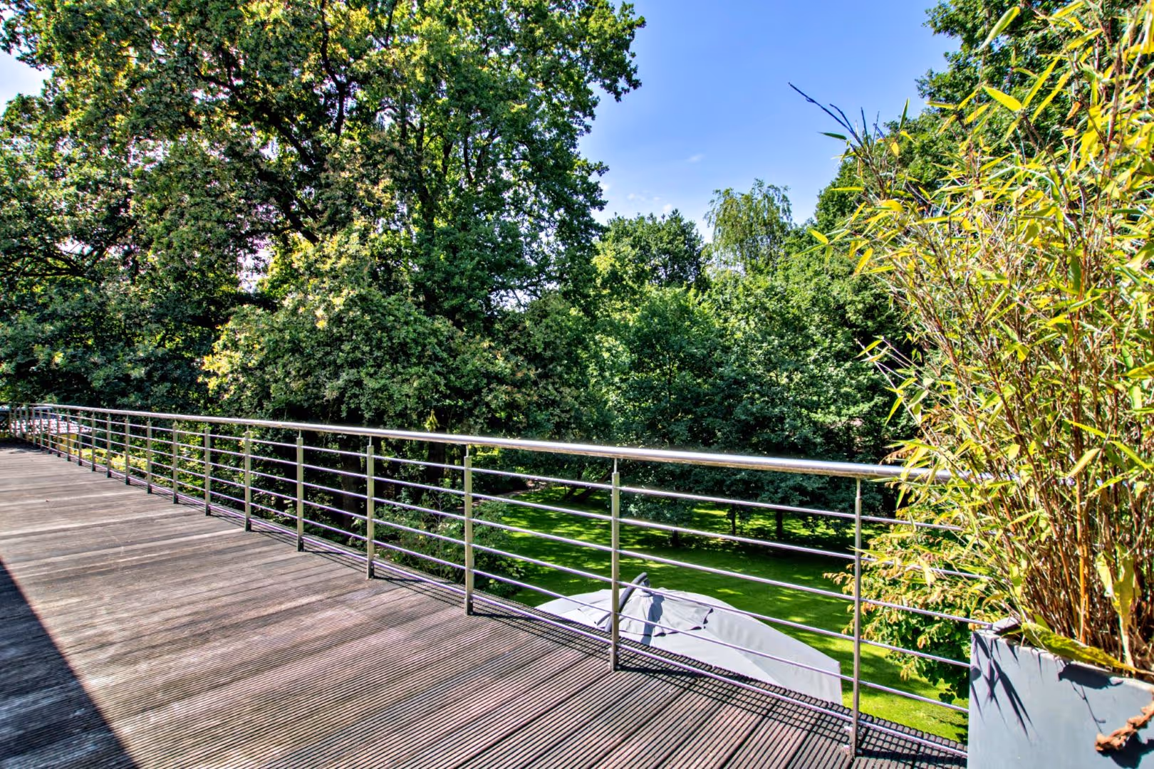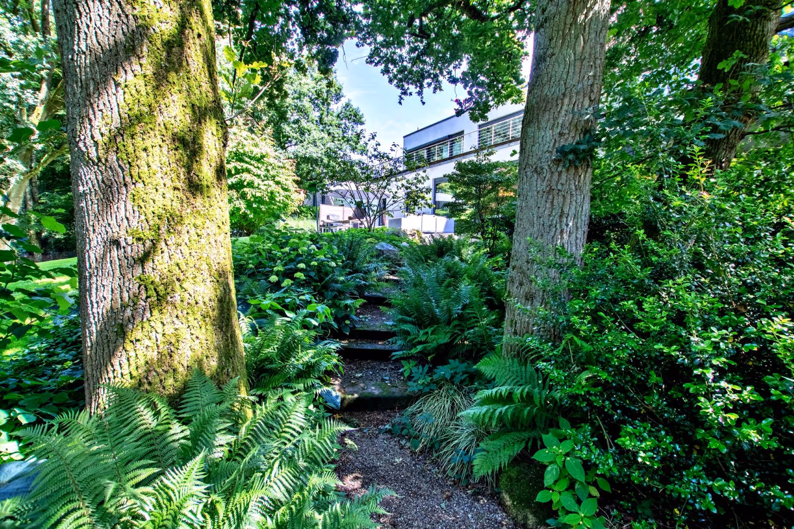 Die großzügige, blickdichte Gartenanlage mit Terrasse lädt zum Verweilen im Freien ein. Der leichte Hügel schafft eine natürliche Struktur, während der erhöhte Ausblick für eine besondere Atmosphäre sorgt.