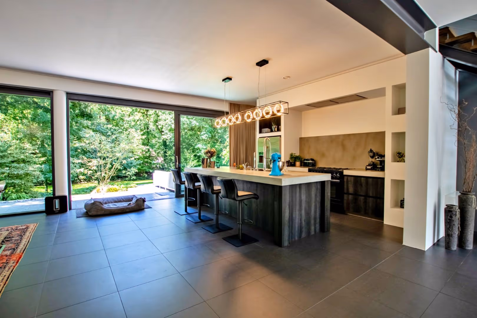 Der offene Essbereich vereint Küche, Tresen und Esszimmer zu einem großzügigen Lebensmittelpunkt. Eine moderne Kücheninsel setzt Akzente und schafft Funktionalität. Große Fensterfronten öffnen den Blick in den Garten und lassen viel Licht in den Raum.